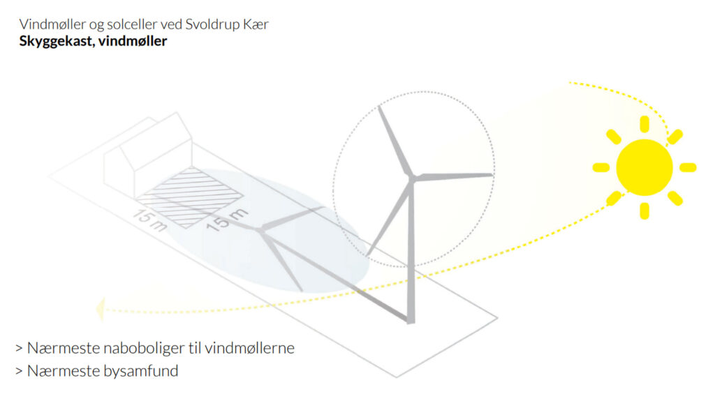 Selvom en bolig, jf. nedenstående kort teoretisk set får mere end 10 timers udendørs skyggekast om året. Dette giver dog ikke anledning til problemer, eftersom den eller de vindmøller, som forårsager skyggekastet hos den respektive nabo, vil blive forsynet med en skyggestyring der sikrer, at vindmøllerne vil blive stoppet i perioder med skyggekast på en given beboelse, hvorved sikres, at den reelle skyggepåvirkning ikke kommer til at overstige 10 timer om året i forhold til en given beboelse.