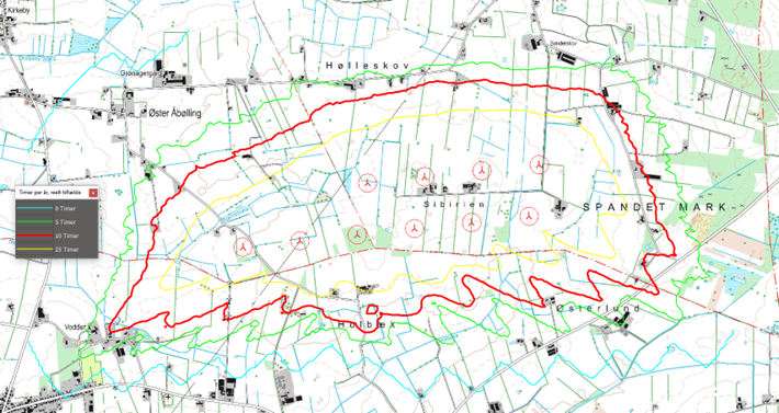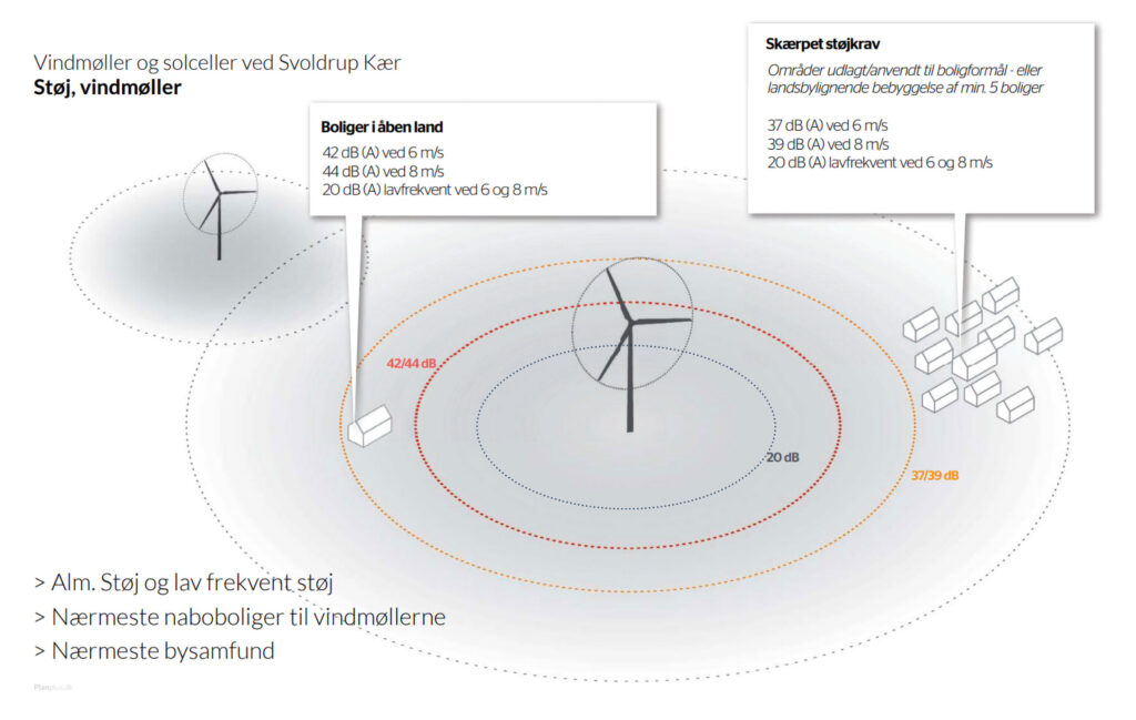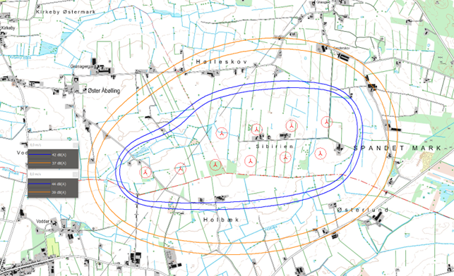 Af nedenstående kort fremgår det, at det planlagte vindmølleprojekt overholder støjkravene med god margin ved alle nabobeboelser i det åbne land, det samme billede gør sig gældende ved en vindhastighed på 8 m/s. For områder med støjfølsom arealanvendelse overholdes støjen også.
